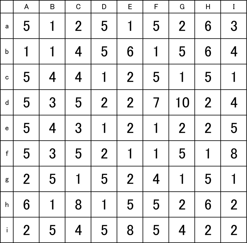 ※図1- 1. タテの位置をアルファベット大文字、ヨコの位置をアルファベット小文字で示した格子状の解答欄を用います。